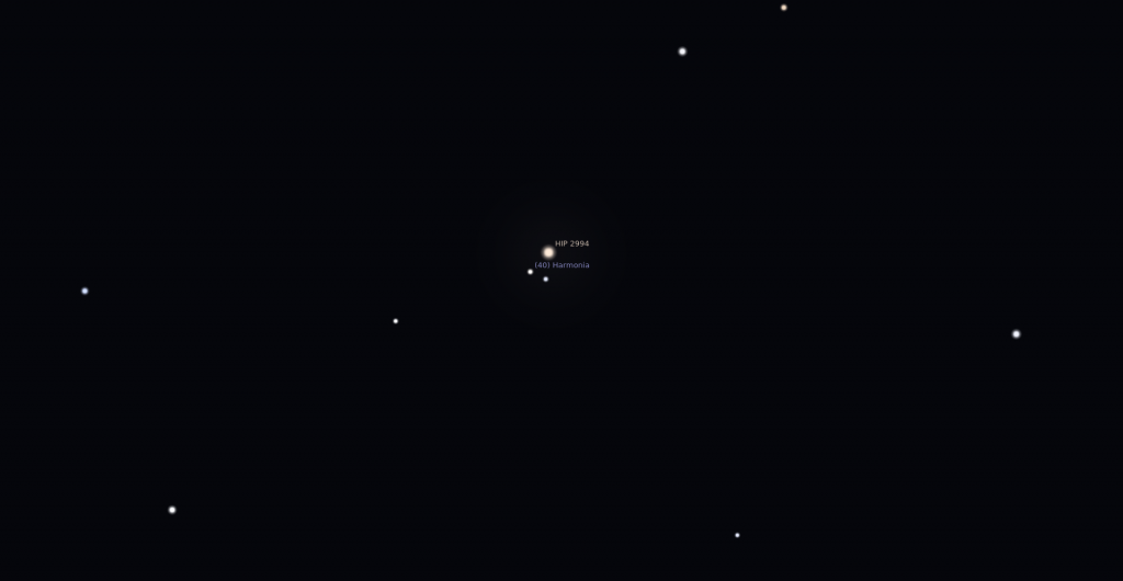Ugyanaznap, kicsit később a Harmonia kisbolygó közelít meg egy szabad szemmel ugyan már nem látható (6.6 magnitúdós), mégis érdekes csillagot, a 15 Cet-et. A K1 színképtípusú óriáscsillag tőlünk mintegy 834 fényévre található, mely magyarázza halványságát a méretéhez és a fénykibocsájtásához képest. Érdekessége, hogy kettőscsillag, kísérője 25.7 ívmásodpercre található, sajnos nagyon halvány, vizuálisan csak nagyobb (25 cm feletti) távcsövekkel figyelhetjük meg a 13.5 magnitúdós csillagot.