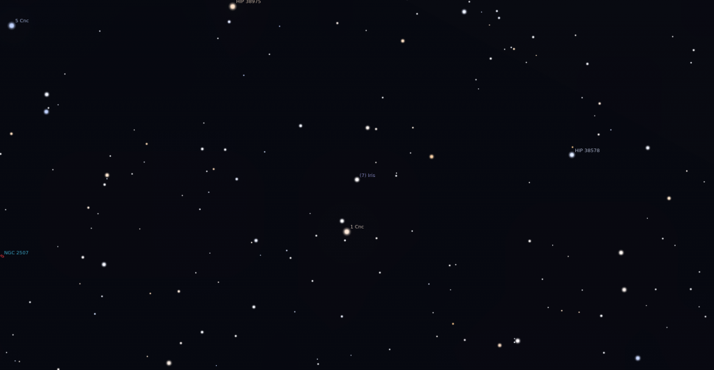Aznap este egy újabb oppozíció, a (7) Iris mosolyog ránk. Végre egy fényes kisbolygó! A 8.1 magnitúdó már elég ragyogó ahhoz, hogy akár kézben tartott binokulárral is megfigyelhessük. Ráadásul nagyon könnyű megtalálni, mert egy halvány, de szabad szemmel is látható csillag, az 1 Cnc (Cancer) mellett, attól északra találjuk alig 10 ívpercre. Ha a csillag megvan, meg lesz a kisbolygó is!