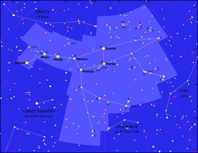 - ε (epszilon) UMa (Alioth): a csillagkép legfényesebb csillaga (1,8 magnitúdó). Forró, fehér csillag, 65 fényévnyire.