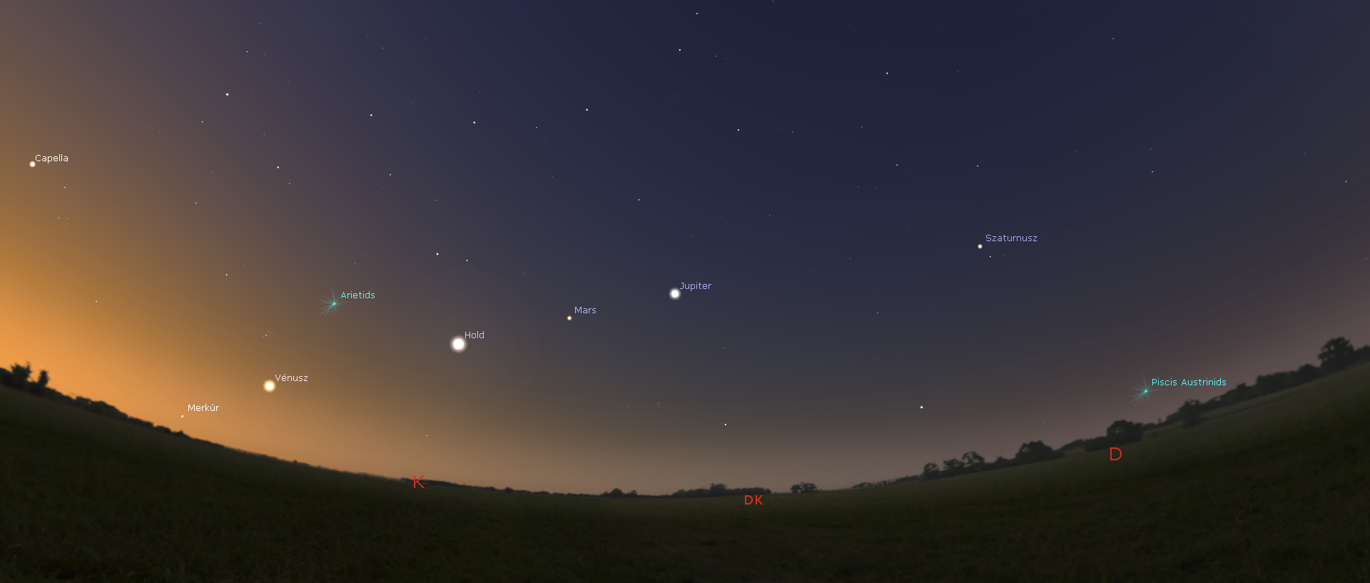 A kép a Stellarium programmal készült és a 24-i állapotot mutatja hajnali 4 előtt 10 perccel. Amikor feljebb azt írtuk, hogy az összes bolygó egyszerre fog látszani, nem túloztunk: a képen nem látszik, de az Uránusz bizony ott lapul majd a Vénusz és a Mars között (24-én ráadásul a Vénusz és a Hold között, de ne feledjük, a Hold folyamatosan vándorolni fog szépen sorban a Szaturnusztól a Merkúrig), a Neptunusz pedig bizony ott lesz a Jupiter és a Szaturnusz között.