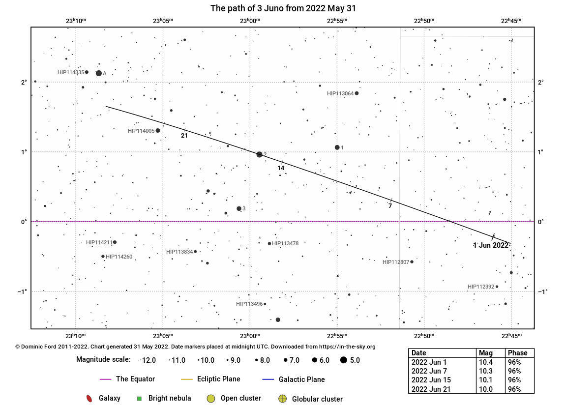 Amint az látható, a Juno pályája 16-án 1:28 perckor mindössze 5 ívpercre közelíti meg a 2 Psc csillagot, ami egy 5-6 magnitúdós, már-már szabadszemes csillag, vagyis, ha valaki még sohasem észlelt kisbolygót, ez a tankönyvi ideális eset arra, hogy most kipróbálja! A kisbolygómegfigyelés rákfenéje a kisbolygó megtalálása – nos, keresve sem találhatnánk ennél jobb jelzőtáblát. A hajnali égen keressük, fél kettőkor már eléggé kedvező, 16 fok magasan jár a keleti égen.