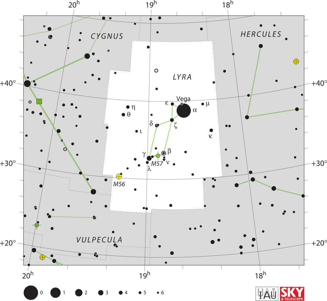 • Messier 57 (Gyűrű-köd): egyik legismertebb planetáris köd, amely a Földtől 2000 fényév távolságban van. A második köd, amelyet felfedeztek. Fényessége kb. 8,8 magnitúdó. Egy ilyen köd akkor keletkezik, amikor egy csillag fejlődésének utolsó szakaszában van (mielőtt fehér törpévé válna), és ionizált gázból álló hatalmas fényes burkot bocsát ki a környező csillagközi térbe. A köd külső része a fényképeken vörösnek tűnik az ionizált hidrogénből származó emisszió miatt. A középső régió zöld színű: a kétszeresen ionizált oxigén zöldeskék fényt bocsát ki. A legforróbb, a központi csillaghoz legközelebbi régió pedig a hélium emissziója miatt kéknek tűnik. Maga a központi csillag egy fehér törpe. A távcsövekben a köd egy látható, zöldes árnyalatú gyűrűként jelenik meg. A Vegától délre található.