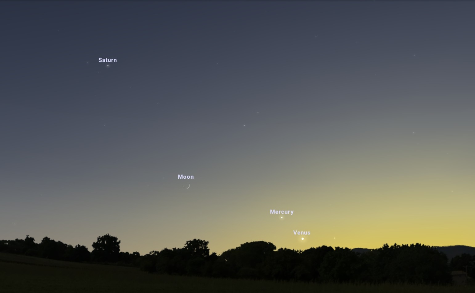 Dec. 25-én a legjobban látszó Merkúr, a Vénusz, illetve a vékony holdsarló „vonatot”, füzért alkotnak az égen naplementekor, távolabbról társul hozzájuk a Szaturnusz. Pompás négyesfogat, ez már szabad szemmel is jól látszik, mindenképp nézzük meg!