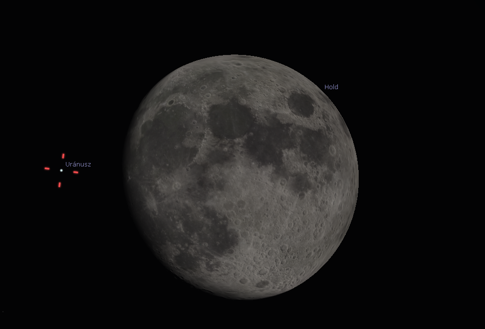 Bizony, ilyen is van, ezévben már a harmadik, amit most a legideálisabb körülmények közt figyelhetünk meg! A 94,1%-os, növekvő fázisú Hold 17:32 perckor elfedi az 5,6 magnitúdós Uránusz bolygót. A belépés a Hold sötét oldalán történik majd, zavaró holdfénytől mentesen. Jó előre, akár 10 perccel hamarabb is készüljünk már rá az eseményre, azonosítsuk be az Uránuszt, és lesben állva várjunk!