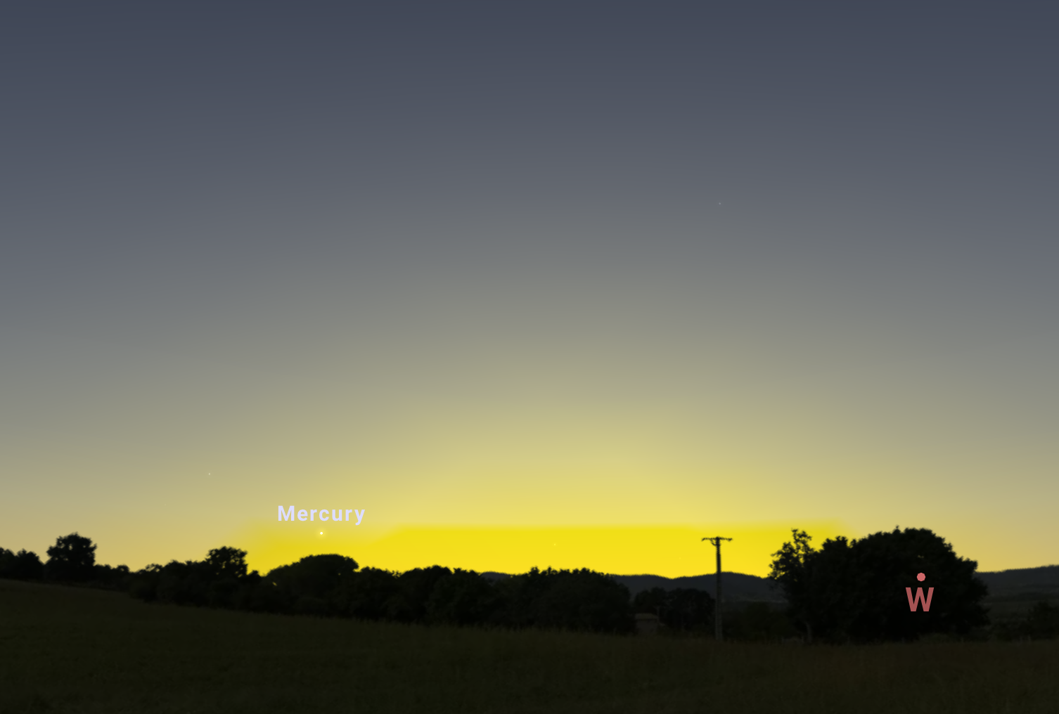 A legbelső bolygó láthatósága folyamatosan javul ebben a hónapban, ahogy az ekliptika hajlásszöge nő a látóhatárhoz viszonyítva. A 6,6 ívmásodperces, -0,4 magnitúdós Merkúr 4-én lesz legnagyobb keleti kitérésben, bő egy órával nyugszik a Nap után a polgári szürkület végén.
