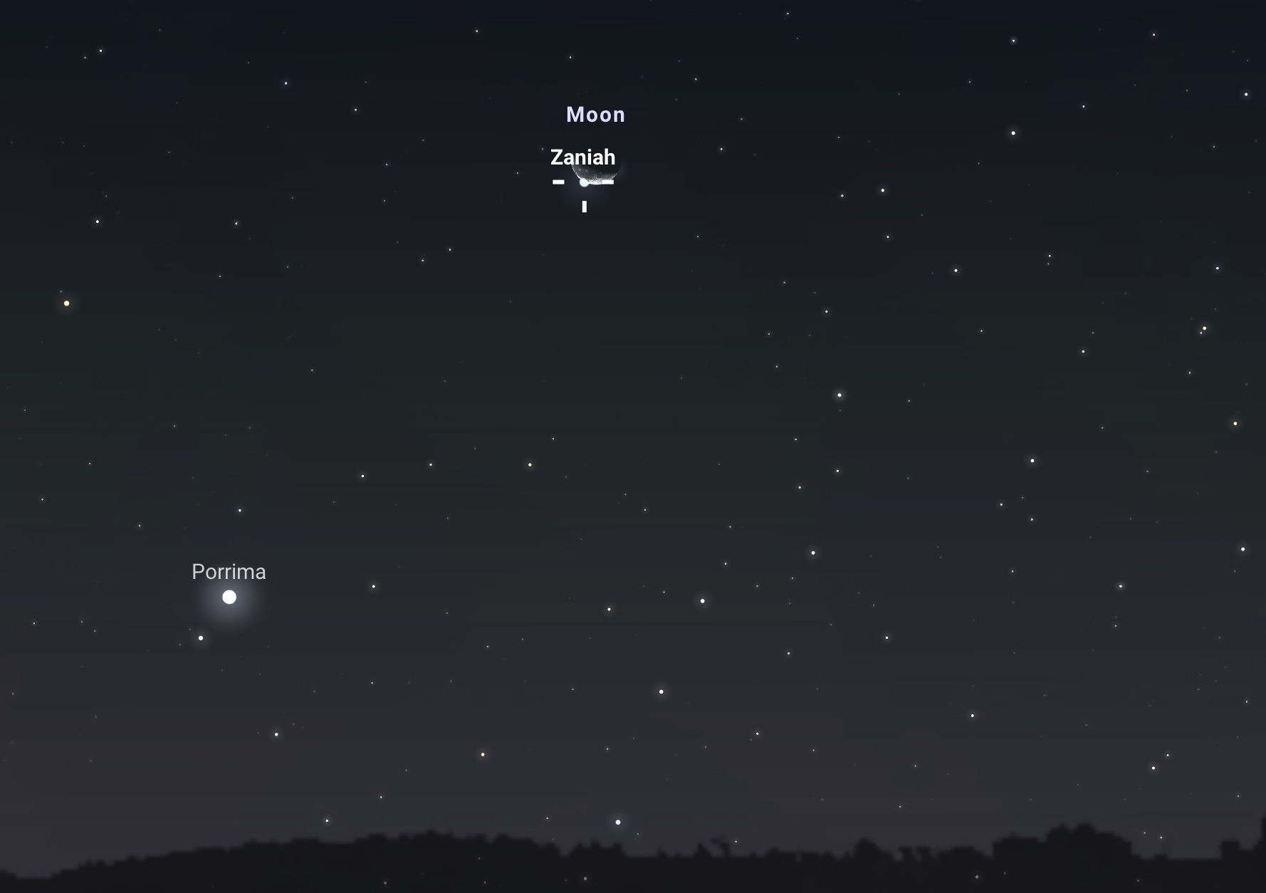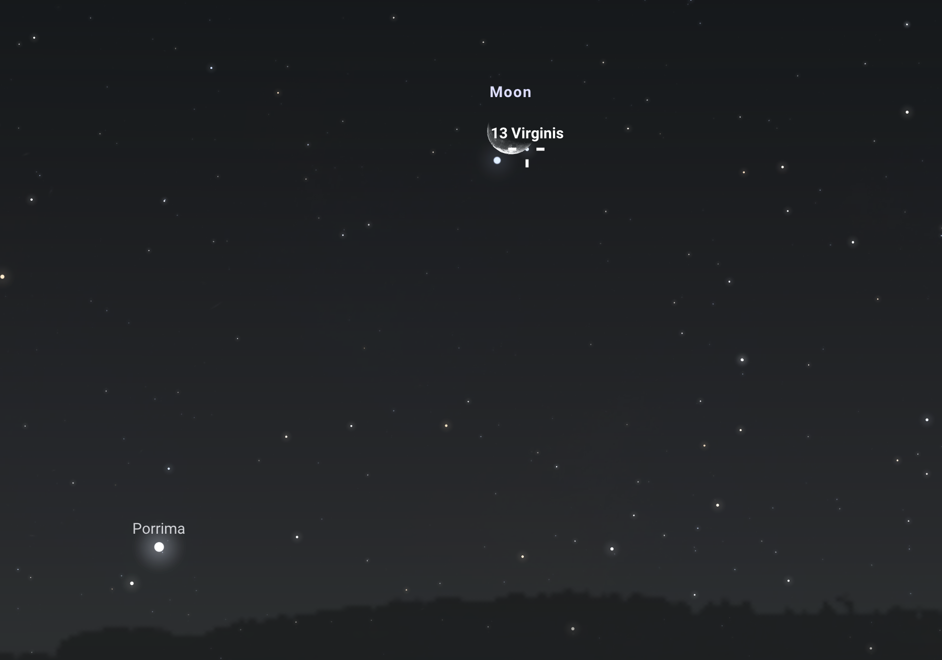 1:35-kor a kelő, 33%-os holdsarló az 5,3 magnitúdós 13 Vir-t „kebelezi be”, majd 12 perccel később, 1:47-kor következik a 3,9 magnitúdós Éta Virginis, azaz a Zeniah.