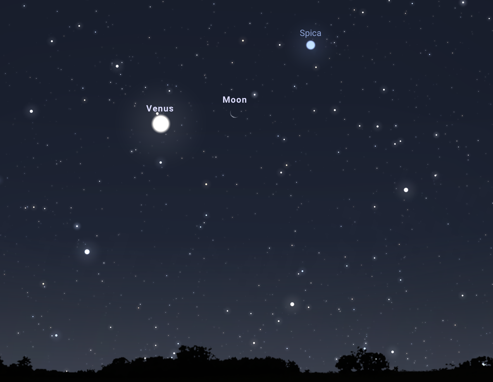Ezen a hajnalon a szabadszemes észlelések szerelmeseinek érdemes kicsivel korábban kelni, ugyanis 5:40-kor szépséges látványt ígér a -4 magnitúdóval ragyogó Vénusz, az attól 5 fokra található 15%-os holdsarló és a további hét fokra látható Spica, a Szűz csillagkép kék óriáscsillaga.