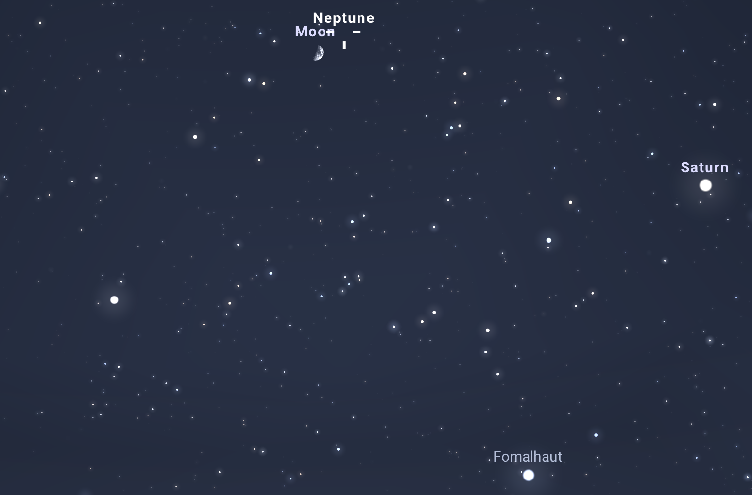 Neptunusz: A sötétedés végére a közel 40 fok magasan delelő apró bolygó még kiválóan megfigyelhető, 7,9 magnitúdós fényessége mellé 2,3"-es korongátmérő társul.