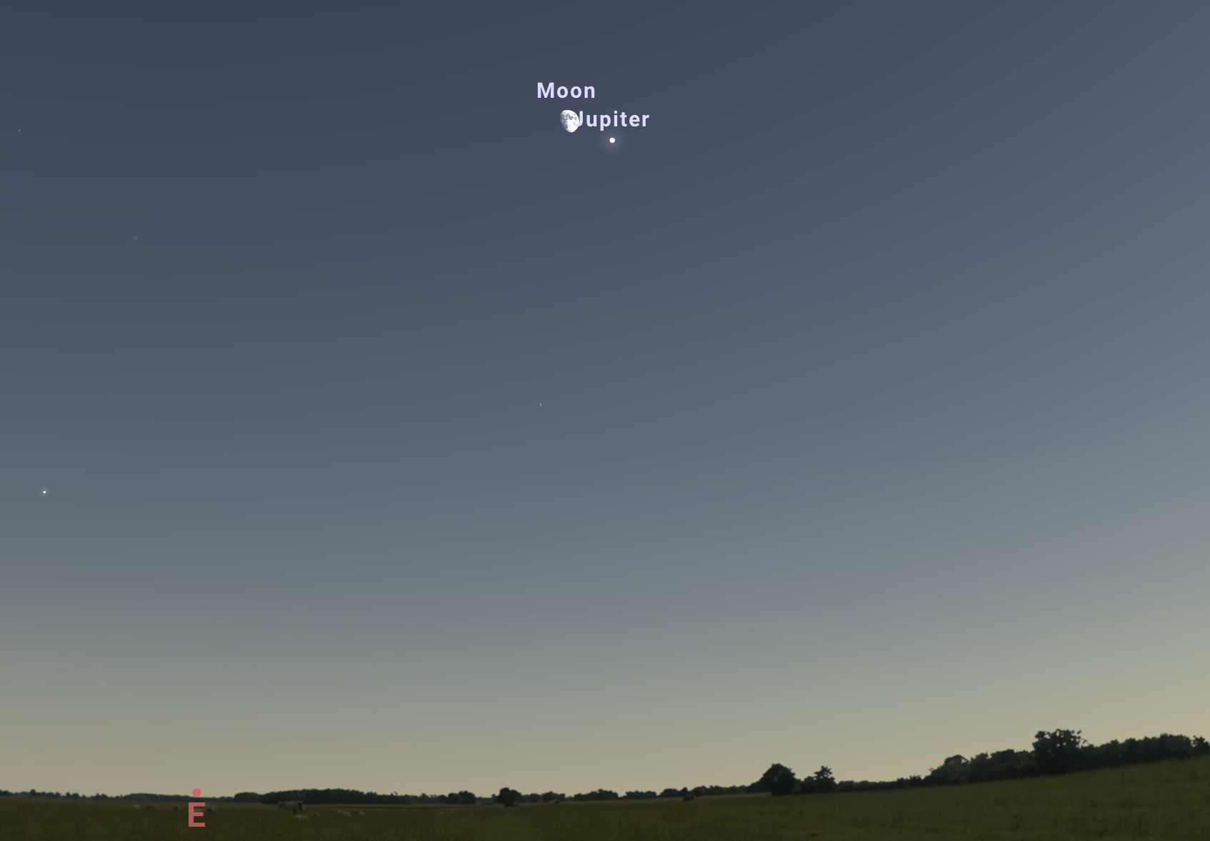 A december 22-én hajnali 3:27-kor bekövetkező téli napfordulót – azaz azt az időpontot, amikor a Föld északi félgömbjén a Nap legalacsonyabban delel – egy látványos együttállással ünnepli az égbolt: 16:30-kor, a polgári szürkület végén a -2,5 magnitúdóval ragyogó Jupiter és a 80%-os fázisú Hold mindössze 2,2 fokra lesz egymástól a keleti – délkeleti égbolton.