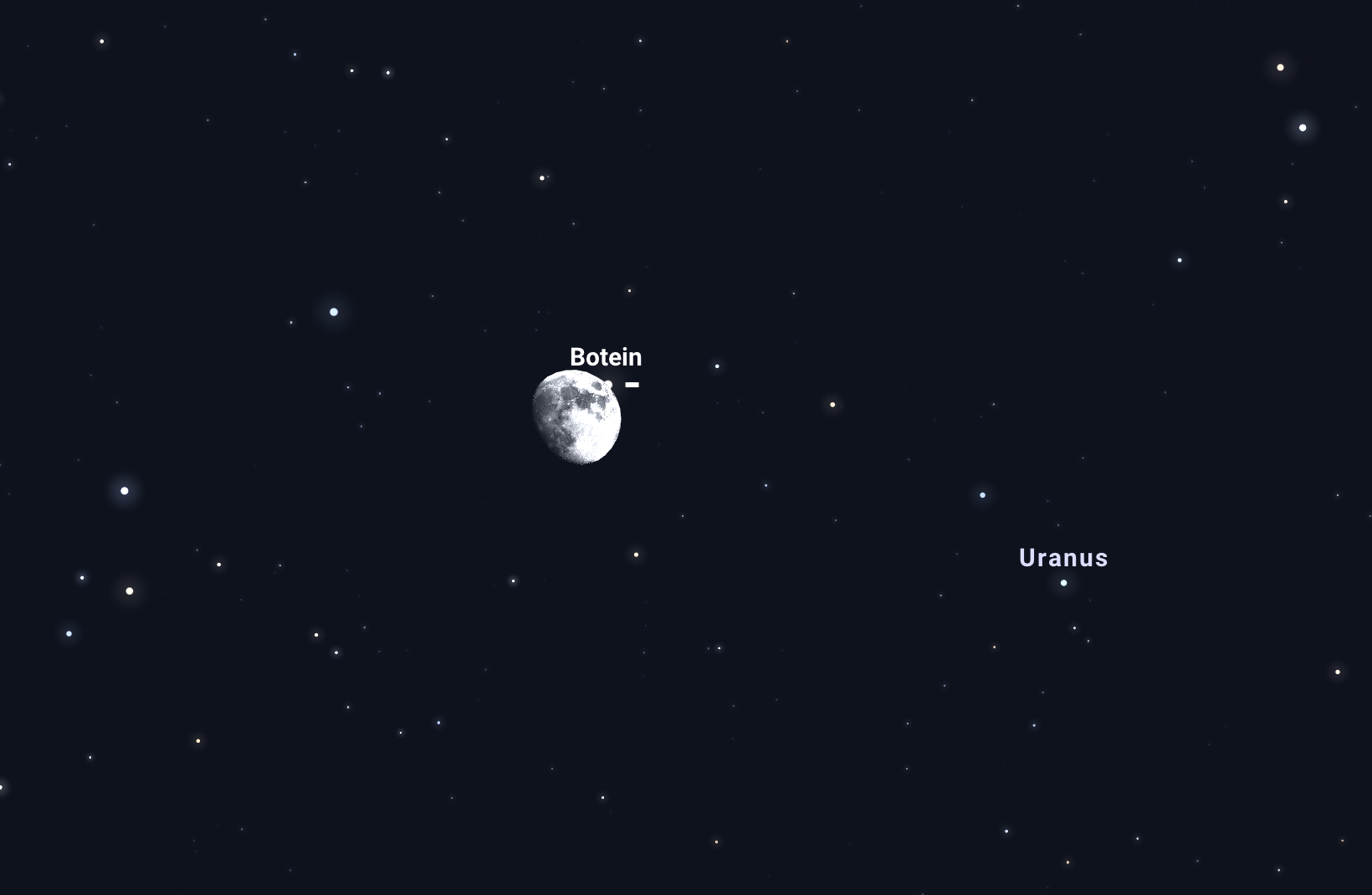 16:17-kor, a szürkületben a 4,4 magnitudós Delta Ari, azaz a Botein tűnik majd el a Hold sötét oldalán, a csillag kilépésére 17:13-kor kerül sor.