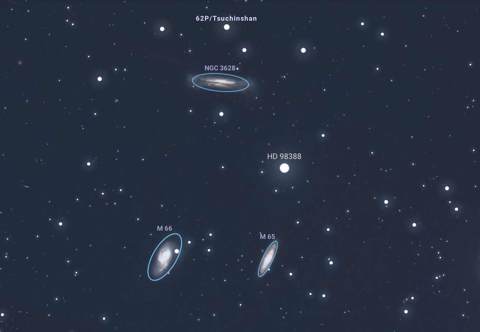 A korábban már említett napközelben levő periodikus üstökös, a 62P/Tsuchinshan ezen az éjszakán az Oroszlán csillagkép galaxisai között jár majd, az igazi nagyvadra vadászók legnagyobb örömére.