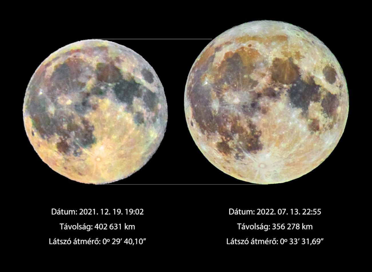 A két égitest együttállásán kívül egy másik izgalmas jelenséget is megfigyelhetünk, amely a Holdhoz kapcsolódik. Égi kísérőnk 384.400km-es átlagos távolságban helyezkedik el, azonban a távolság folyamatosan változik, amelynek következtében minden hónapban van egy földközeli és egy földtávoli nap. Az mostani teleholdkor ez a távolság 354.000–356.000 km között lesz. A közelség következtében az égitestet 12%-kal nagyobbnak látjuk, mint amikor legtávolabb van a Földtől. Sajnos ez az eltérés nem elég nagy, hogy észrevehető legyen szabad szemes vagy távcsöves észlelésnél, azonban fényképeken nagyon jól meg lehet figyelni. A teliholdban egészen reggel 5:35-ig gyönyörködhetünk, majd lebukik a horizont alá.