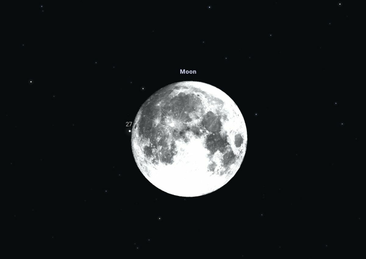 Holdtúránk után elérkezik az est fénypontja, amikor hűséges égi kísérőnk, a Hold két csillagot is el fog fedni. Ekkor már 39 fok magasan lesz, a déli égbolton 00:05-kor fog a nyugati oldalán belépni a 27 Psc csillag a Grimaldi-krátertől délre, ami a Copernicustól délnyugatra, a Hold peremén helyezkedik el.. Szabad szemmel fényszennyezésmentes égen is nagy kihívás észlelni a csillagot, mivel a fényessége 5 magnitúdó. A Halak csillagképben tőlünk 234 fényévre található csillag G színképtípusú, emiatt a Napunkhoz hasonlít. A csillag egy órával később, 01:06-kor fog kilépni a Hold délkeleti részén.