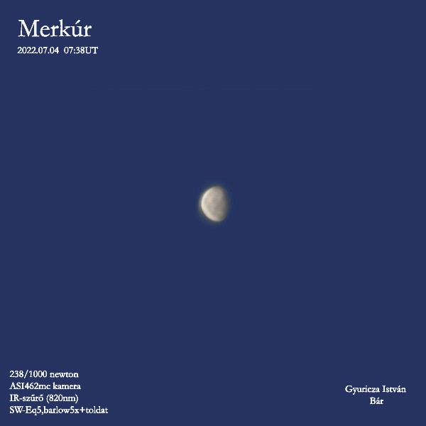 A hónap 4. napján indul a Naprendszer legkisebb bolygójának (ez sajnos már nem a Pluto) láthatósági szezonja, de már elsején is egy és negyed órával kel a Nap előtt. 8-án ér maximális nyugati kitérésbe, ekkor 18 fokra jár a Naptól, egyúttal dichotómiában látható (ez a félmerkúr). Legjobb láthatósága 9-én lesz. A jó megfigyelhetőség 24-éig tart, használjuk ki. A Merkúr megpillantásához türelemre van szükség, keresőtávcső vagy binokulár használata melegen ajánlott. 24-én, láthatósága zárásaként 4,6 fokra délkeletre látszik a hajszálvékony holdsarlótól. A hajnali szürkület pompás égitestét érdemes lehet lefényképezni vagy lerajzolni.