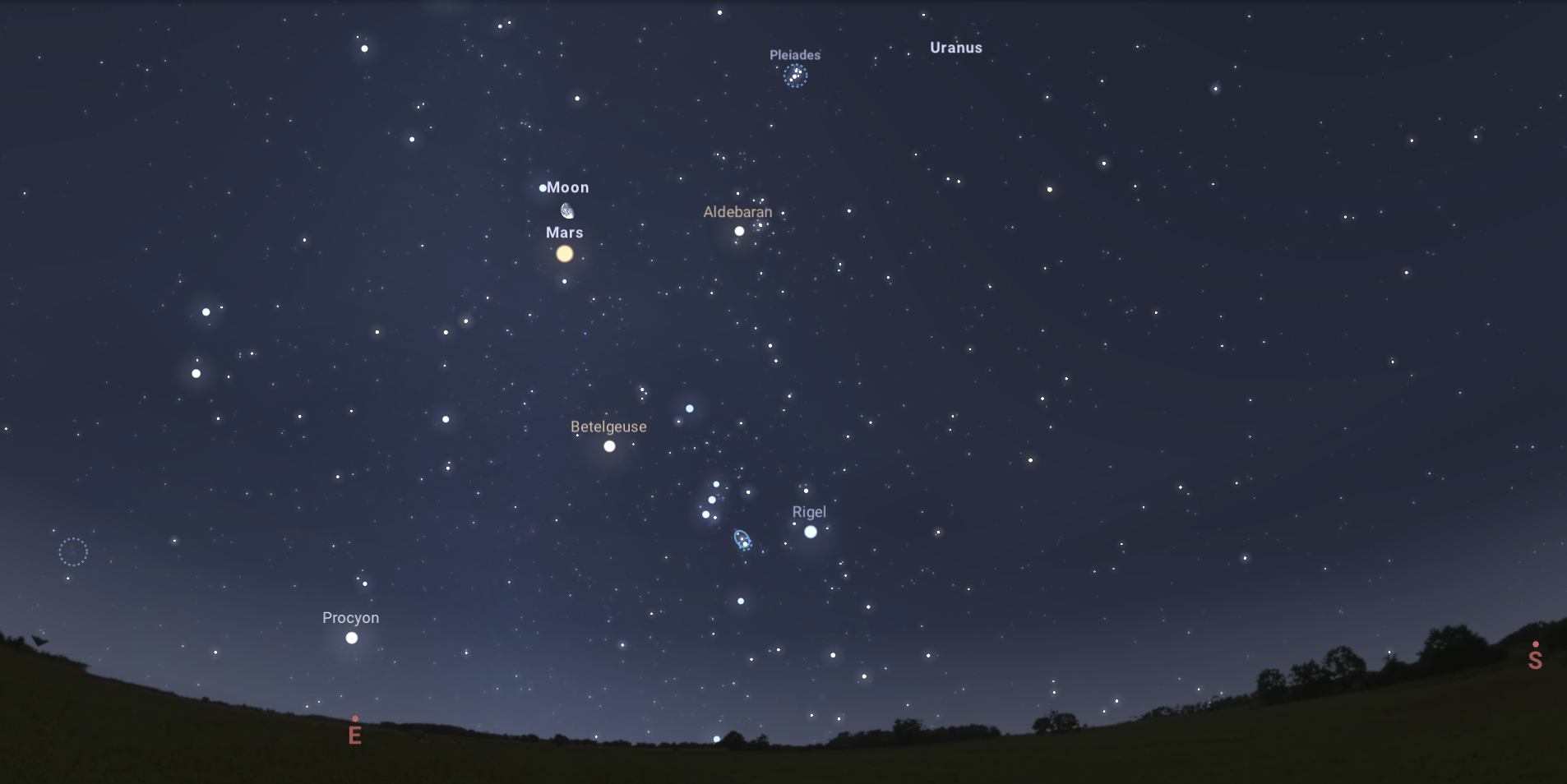 Az oppozíció felé menetelő vörös bolygó elsején hajnalban szép együttállással ajándékoz meg minket, ugyanis mindössze 9 és fél ívpercre közelíti meg a 108 Tauri jelzésű csillagot. Ez az együttállás különösen szép lesz, a 108 Tau ugyanis egy 6,3 magnitúdós, halványkék csillag, ami különösen jól illik majd a Mars vakító vöröséhez. Binokulárban nyújt igazán szép látványt, szabad szemmel a halvány csillag nem látható.