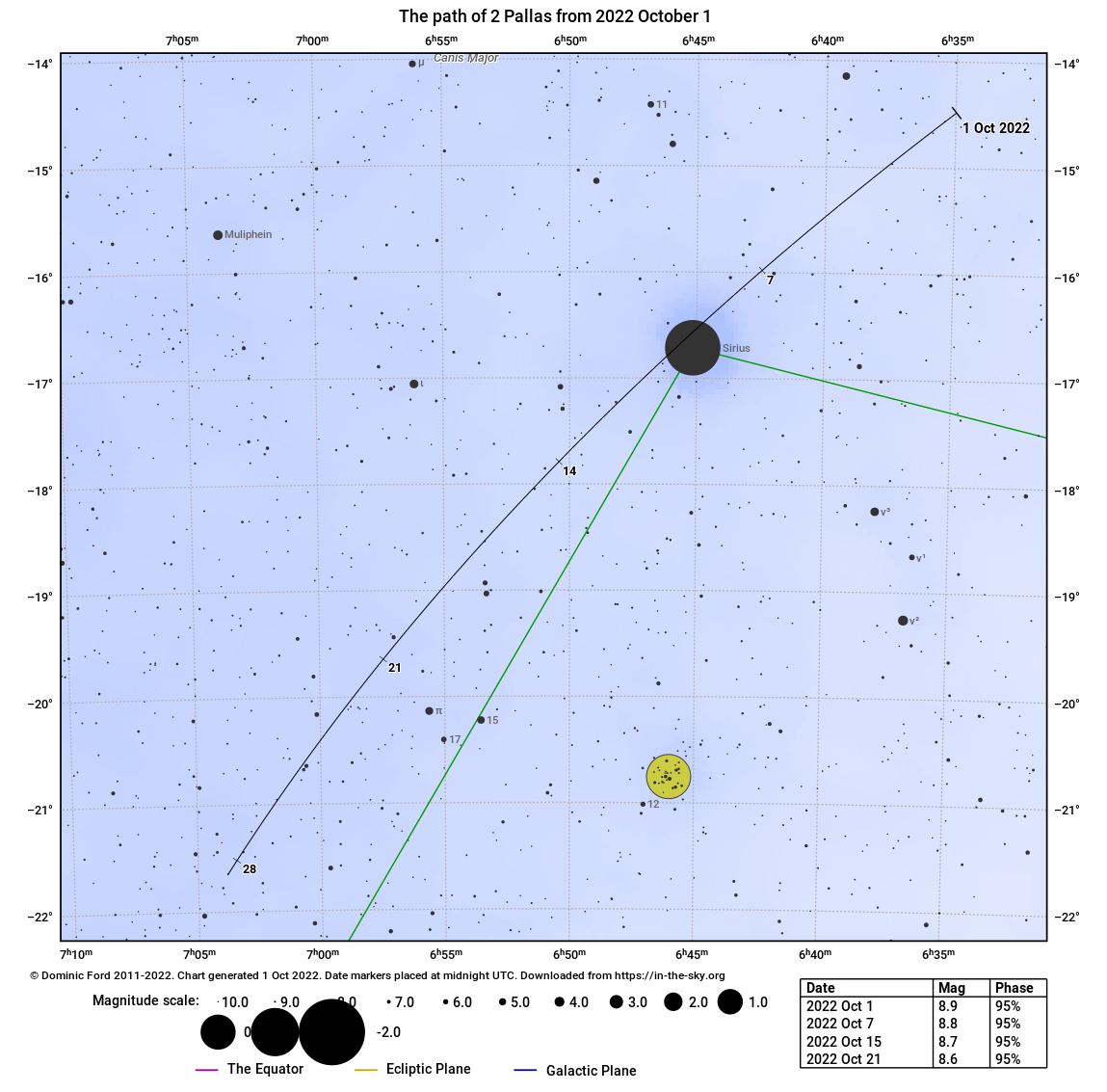 Egészen pontosan 13 ívpercnyire, ami a Hold látszó átmérőjének köze fele. Az égbolt legfényesebb csillaga, a -1,46 magnitúdós Sirius játszi könnyedséggel tenné láthatatlanná a mindössze 8,85 magnitúdós Pallas kisbolygót, azonban az említett szögtávolság elég ennek megakadályozására. Ha még sohasem láttál kisbolygót, itt az alkalom – a Siriust érdemes megkeresni akkor, amikor delel, ez hajnali 4 óra körül van, s tőle kissé északkeletre látható a Pallas. A keresőtérkép nagy felbontásban itt található.