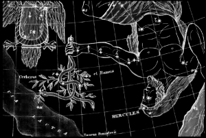 Az Uranometria, Bayer 1603-as, meghatározó atlasza volt az első, amely Herkules jobb kezét egy másik kalandjának emlékére tartotta fenn: egy almaágat helyezett bele, ami nem másé volt, mint a heszperidáké. Így született meg később a különálló Ramus Pomifer, azaz “almaág” nevű csillagkép, melyet a térképészek előszeretettel használtak az évtizedek során.