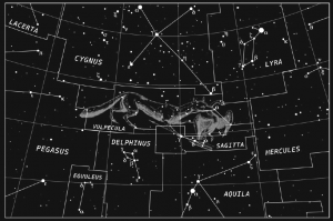 Az immár nagyobbacska Vulpecula csillagkép látványossága az M27, azaz a Súlyzó-köd, ami egy 1400 fényévre elterülő planetáris köd. Valójában egy napszerű csillag élete végén levetett gázburka. Már kistávcsövekben is lenyűgöző látványt nyújt különleges alakjával, ami leginkább egy tisztességesen megcsócsált almacsutkára emlékeztet.