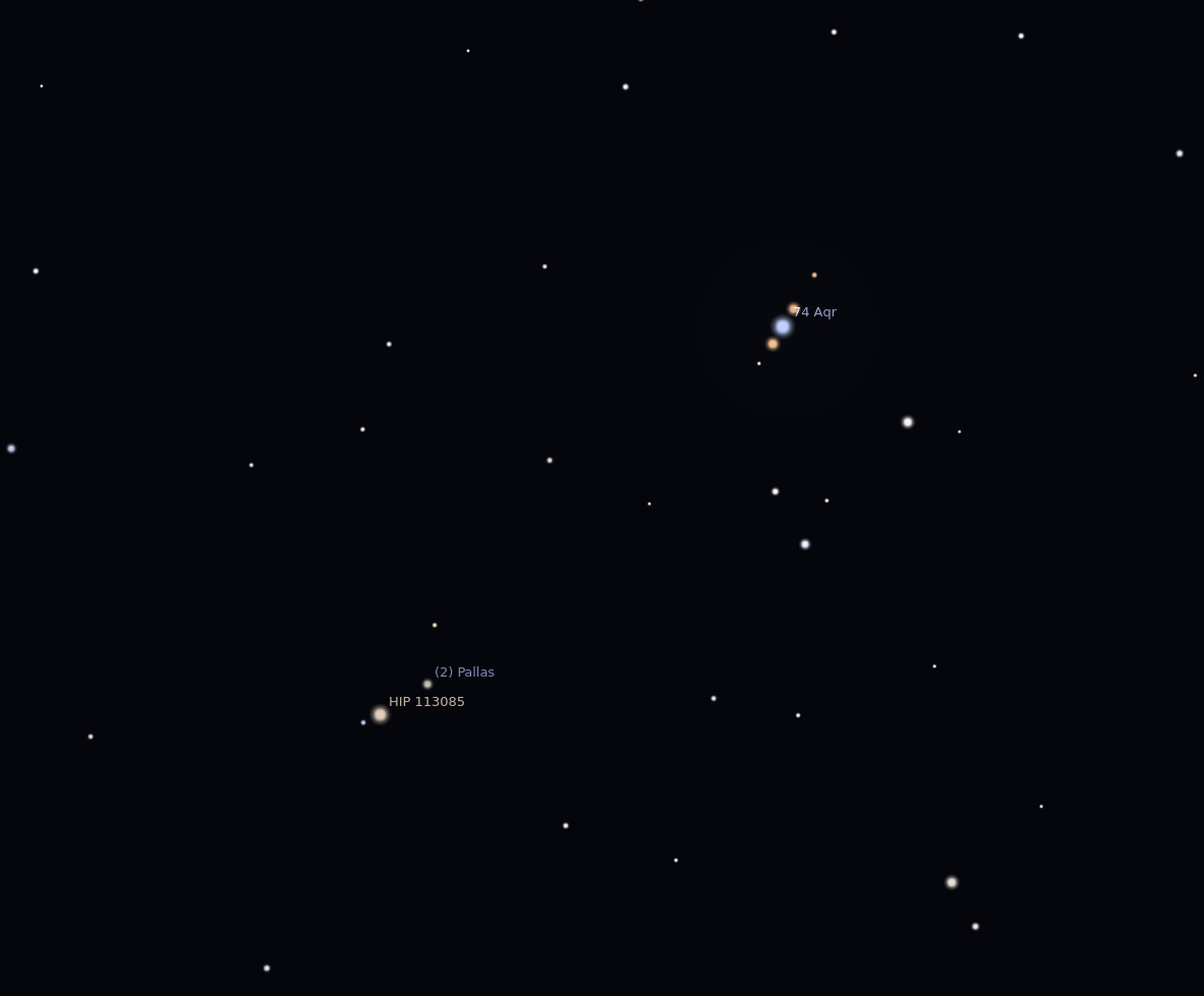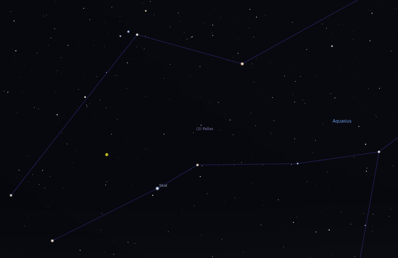 A (2) Pallas kisbolygó számára egy pompás találkozást tartogat az utolsó őszi hónap, melyeknek remélhetőleg mi is tanúi lehetünk. A bölcsesség és a jog ókori istennője egy rocksztárnak is beillő óriáscsillag, a 75 Aqr társaságában tölti a november utolsó napjait.