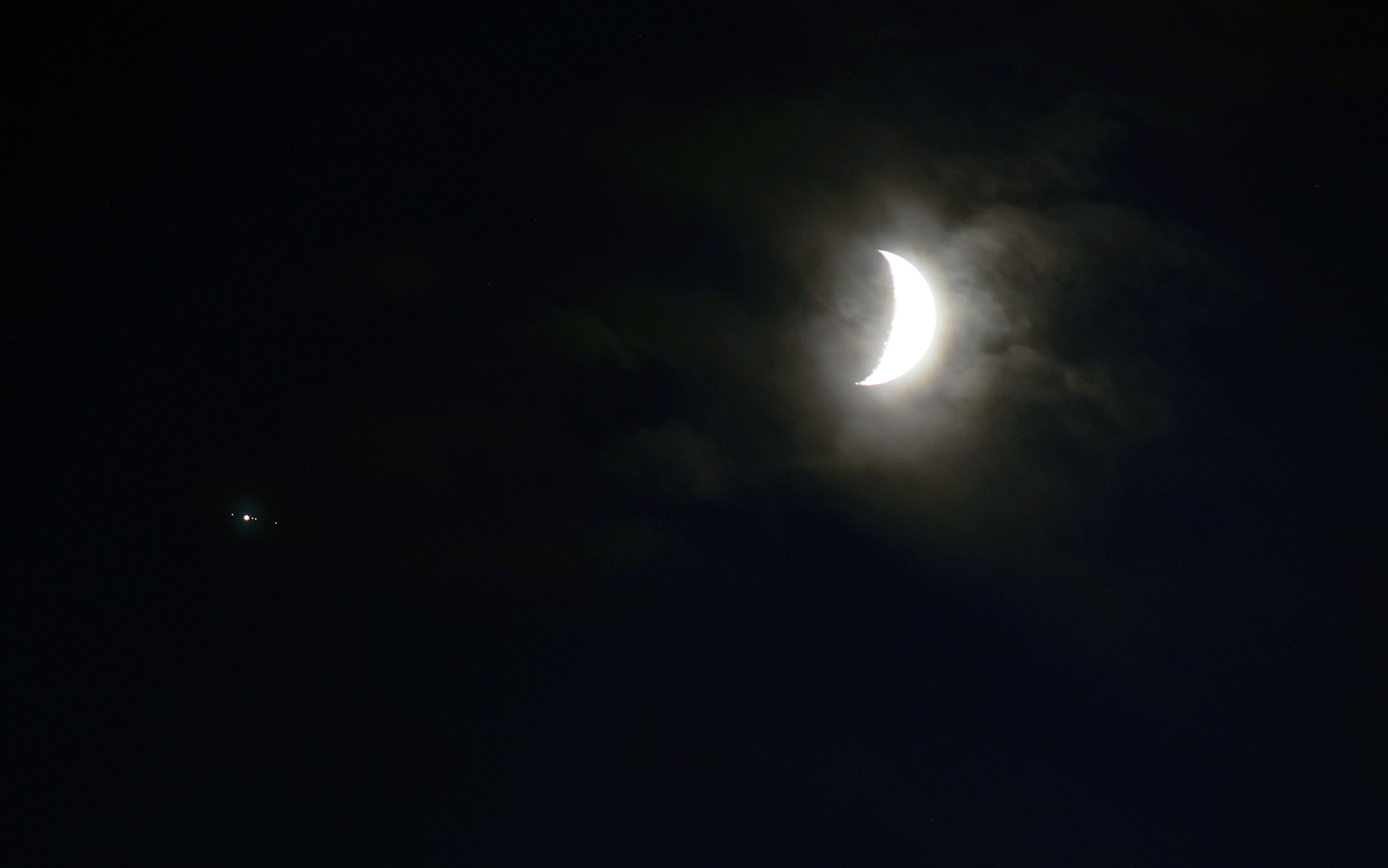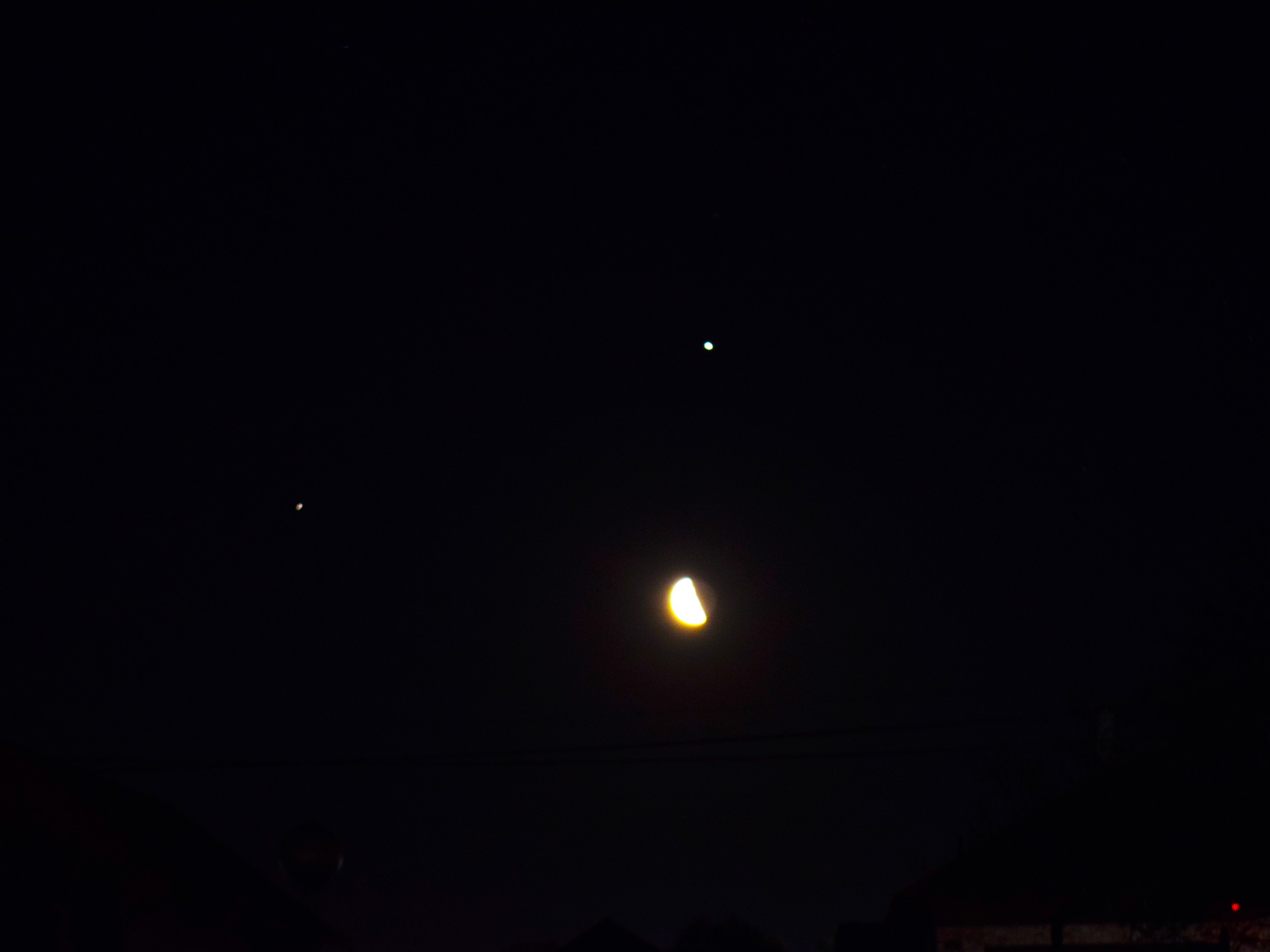 Hegyi Imre fényképén a dagadó Holdat láthatjuk, tőle balra alig két és fél fokra látszik a Jupiter, a szemfülesebbek a négy, szabad szemmel természetesen nem látható Galilei-holdat is észrevehetik.
