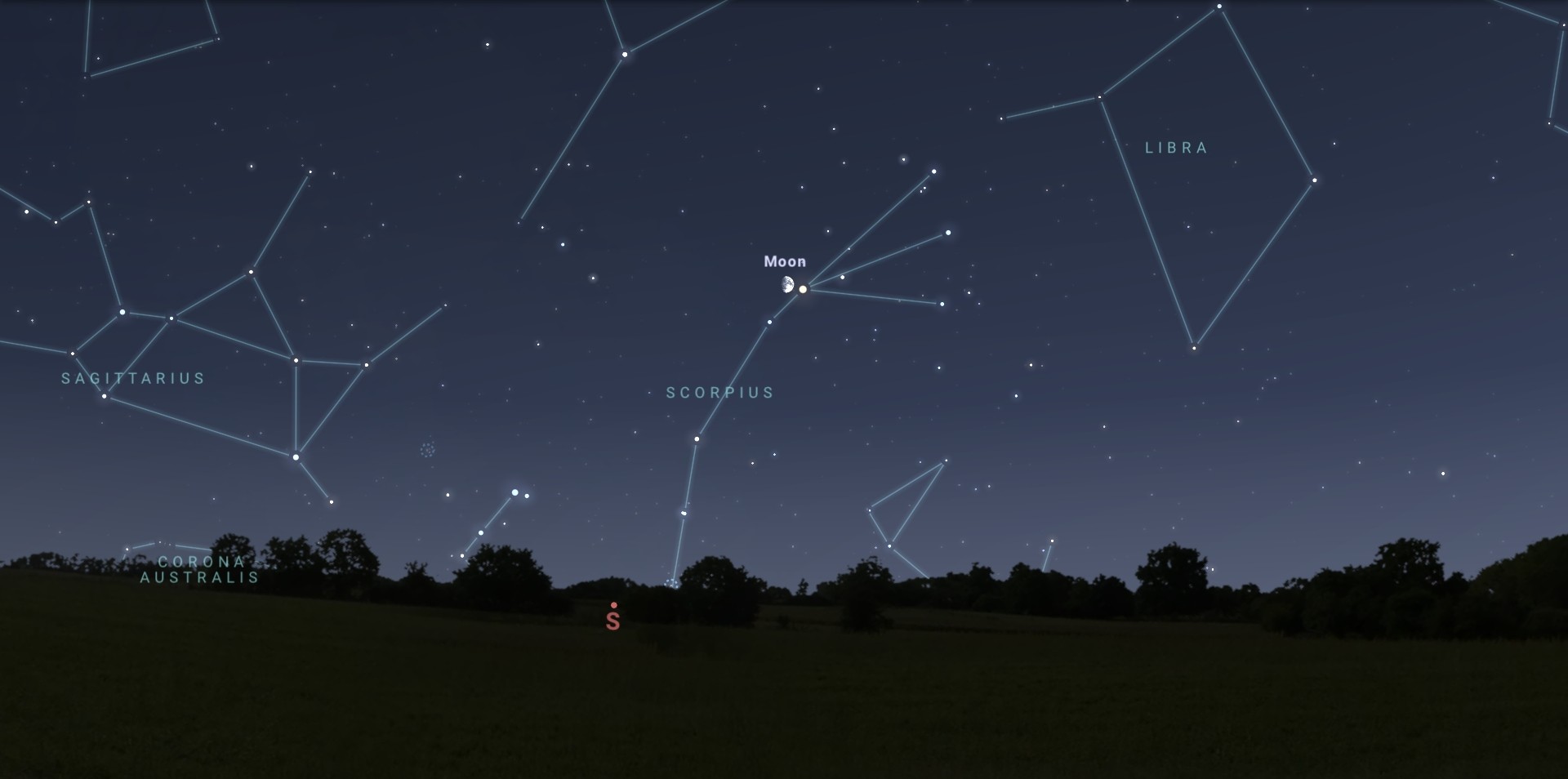 21:30-kor már akár szabad szemmel is megláthatjuk, a páros látszó távolsága ekkor 37 ívperc lesz (ez kicsivel nagyobb, mint a Hold szögátmérője). Fontos észben tartanunk, hogy a Hold nagyon alacsonyan jár, ekkor 16 fokkal tartózkodik majd a horizont felett, vagyis kitakarásmentes déli égboltra lesz szükségünk.