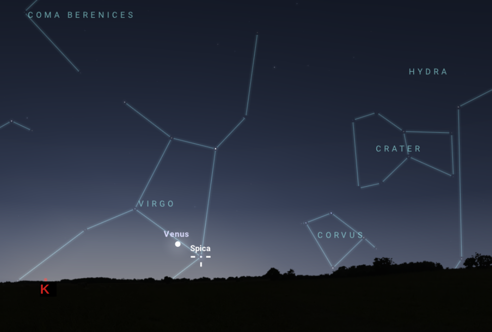 Az első együttállás, amelynek főszereplője az Esthajnalcsillag, vagy ez esetben Hajnalcsillag, illetve a Szűz csillagkép legfényesebb csillaga, a Spica, vasárnap 5:35-kor következik majd be. A két égitest a közelség pillanatában nagyjából 3,5 fokos távolságban látszik majd egymástól. A -3,9 magnitúdós látszó fényességű Vénusz viszonylag könnyedén észrevehető az égen a horizont felett még 3,5 fokkal is. Mivel azonban, ahogy a számok is mutatják, az égitest alacsonyan látszik majd, az észleléshez mindenképpen érdemes olyan helyet választani, ahol a keleti látóhatárt nem takarja mesterséges vagy természetes akadály. A Vénusz megtalálása után a Spica valamelyest halványabb, 1,0 magnitúdós látszó fényességű, kék színű fénypöttye is felötlik, mégpedig Esthajnalcsillagunk alatt jobbra, tehát még közelebb a horizonthoz.