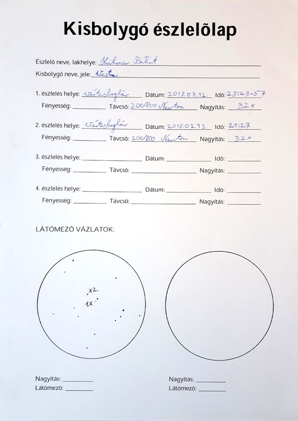 Az észleléshez szükséges észlelőlapot a Magyar Csillagászati Egyesület észlelésfeltöltő oldalán találjuk, ez a link a nyomtatható PDF-hez vezet. Az észlelőlapon nevünk és a megfigyelés helyszínének feltüntetése mellett az észlelések dátumait és időpontjait (UT-ben). A csillagos háttér felrajzolása után a kisbolygó – feltételezett – helyét jelöljük x-szel, és emellé az észlelés sorszámát (1, 2 stb.) vékonyan írjuk fel – lásd Kührner Bálint rajzát. Ez azért szükséges, hogy az elmozdulás iránya a későbbiekben meghatározható legyen.