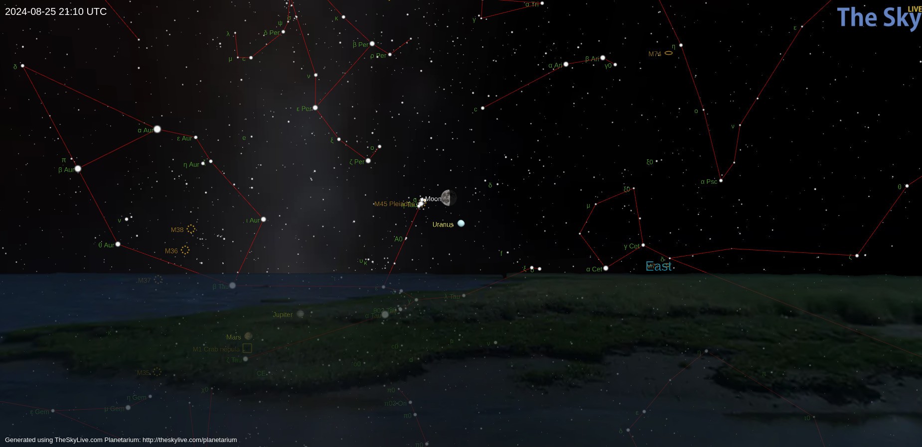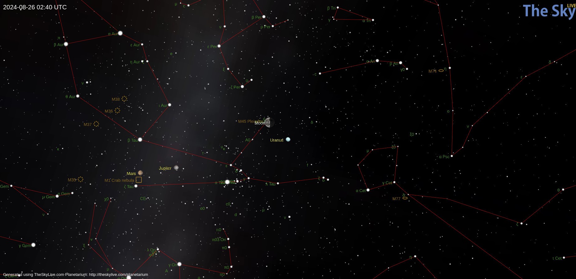 Megéri augusztus 25-éről 26-ára virradó éjjel egy pillantást vetni az égre, és követni a látványos Plejádok halmaz útját, ahogy előbb a Holddal és Uránusszal háromszöget alkot, majd később a szürkületben elfedi a Hold.