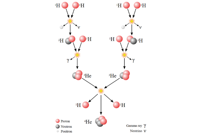A magban rendkívüli forróság uralkodik, nagyjából 15,5 millió K, amely lehetővé teszi a fúziós energiatermelés beindulását. A többféle fúziós folyamat közül leginkább a proton-proton ciklus néven ismert mechanizmus van jelen, amelynek során négy 1-es tömegszámú hidrogénatommag (vagyis proton) egyesül egy 4-es tömegszámú héliumatommaggá jelentős energia-, illetve fénykibocsátás mellett.