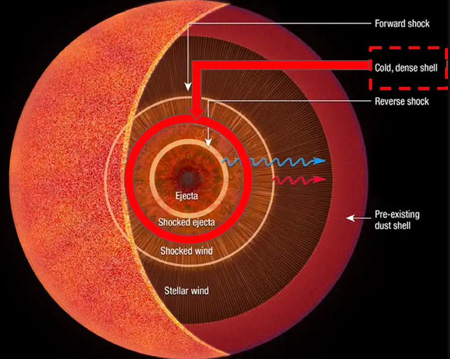 A kutatók szerint a por folyamatos termelődése egy hideg, sűrű porburokkal függ össze, amely a kölcsönható szupernóva körül alakult ki, amikor elkezdett lehűlni. Ez a burok megvédi a belsejében lévő port a lökéshullámoktól, amelyek azóta is kifelé haladnak a környező gázon át.