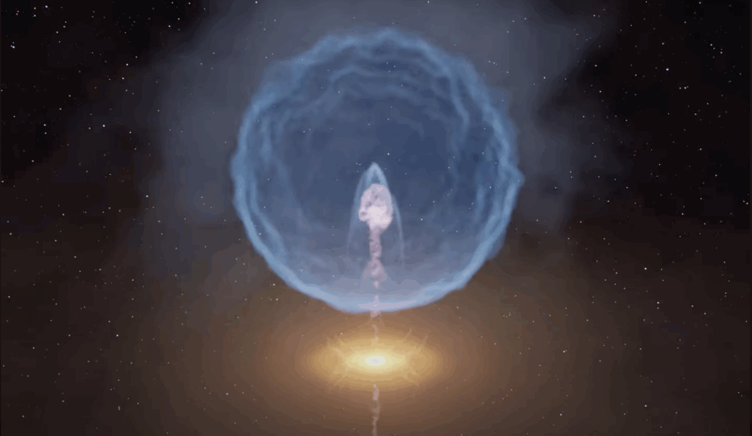 A WSB 52 által több száz évvel ezelőtt kibocsátott nagy sebességű nyaláb beleütközött a koronghoz közeli hűvös gázba, aminek következtében a gáz összenyomódott. A kompresszió következtében megnövekedett nyomás hatására a gáz felrobbant – ez vezetett a táguló buborék kialakulásához.