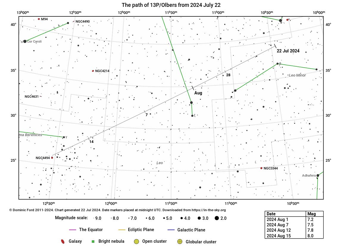 A 13P/Olbers keresőtérképét a július 22-től számított következő 4 hétre alább beágyaztuk a cikkbe. A térkép ezen a linken nyomtatható formában, PNG és PDF formátumban is letölthető.