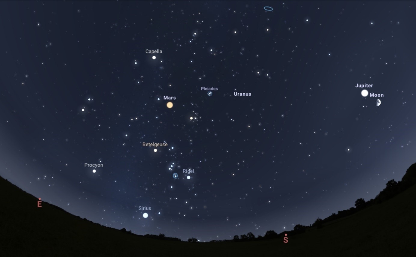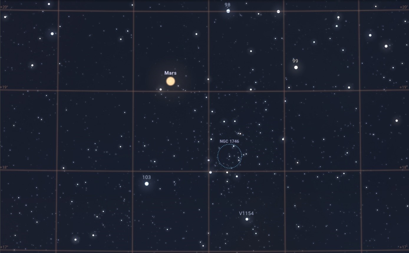 December 4-én pedig az NGC 1746 aszterizmus mellett tündököl majd a Mars. Az aszterizmus kifejezés azt takarja, hogy feltűnően sok csillag sűrűsödik kis helyre, azonban a csillagok nem állnak fizikai kölcsönhatásban egymással, csak véletlenről, a mi perspektívánkból megfigyelhető „optikai csalódásról” van szó. Az NGC 1746 összfényessége mindössze 6,1 magnitúdós, csillagai pedig 8-10 magnitúdósak. Így a 4-én esti, 1,2 fokos együttállás megfigyelésére leginkább 8-10 cm körüli kistávcsövet javaslunk, nagyobb, legalább 2 fokos látómezővel. Külön szépség, hogy a 103 Tau csillag, az NGC 1746 és a Mars egy közel egyenlő oldalú háromszöget alkot majd!