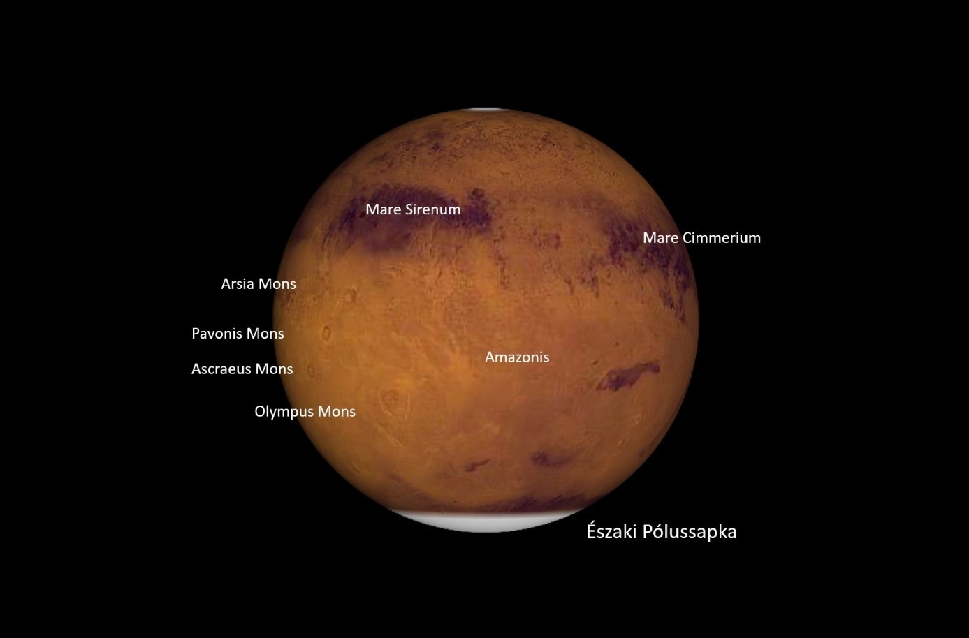 A nagy földközelség napján este 22:00-kor szemügyre véve a bolygót éppen a nagy vörösség és a még nagyobb vörösség kietlen végtelensége néz ránk: az Amazonis-medence déli féltekére is felhúzódó, hatalmas egybefüggő pusztasága. Tény és való, hogy kis távcsővel, kezdő megfigyelők számára ez a bolygó legnehezebben vizsgálható arca. Alul az Északi Pólussapka fehér karimája még ránk mosolyog, a bolygó felső, déli részén a Mare Sirenum és a Mare Cimmerium tengereinek hosszú, íves, foltokra szabdalt szalagja húzódik. Ezek az alakzatok már már 8-10 cm-es lencseátmérőjű, kisebb távcsövekkel is megpillanthatók, 200x nagyítás körül. Nagyobb műszerrel azonban nagy titkok tárulhatnak fel! A bolygó keleti oldalán (égi nyugat felé) a Tharsis magasföld 3 hatalmas pajzsvulkánja, az Ascraeus Mons, a Pavonis Mons és az Arsia Mons közeledik a bolygóperem felé. Apró világos foltjaikat rendkívül nehéz megpillantami, segítségünkre lehet azonban, hogy a lemenő Nap ferde megvilágításának fényében a vulkánok térben enyhén árnyaltak lesznek. A Naprendszer leghatalmasabb pajzsvulkánja, az Amazonis mélyföldjéről 26 km magasságba törő Olympus Mons pedig a korong közepéhez közelebb, északkeleten terpeszkedik. Még ő is rendkívül nehéz célpont, de legalább 20 cm-es távcsővel, nyugodt légkör és egy szemkönnyítő narancssárga színszűrő mellett érdemes a nyomába eredni! Fenséges élmény a rendkívül alacsony kontrasztú, de annál izgalmasabb hegyóriás megpillantása!