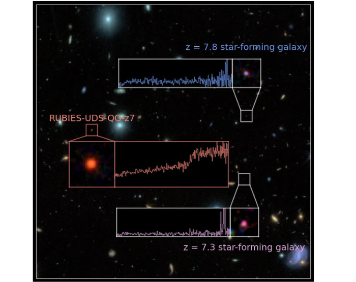 A James Webb-űrtávcső a távoli, fiatal Univerzumot vizsgálva a korábbiakban több nagy tömegű, inaktív galaxist fedezett fel, amelyek 1,2 milliárd évvel az Ősrobbanás után keletkeztek. Később, a RUBIES (Red Unknowns: Bright Infrared Extragalactic Survey) nevet viselő projekt során még fiatalabb halott galaxisokat sikerült felfedezni, többek között a rekordernek számító RUBIES-UDS-QG-z7-et is.