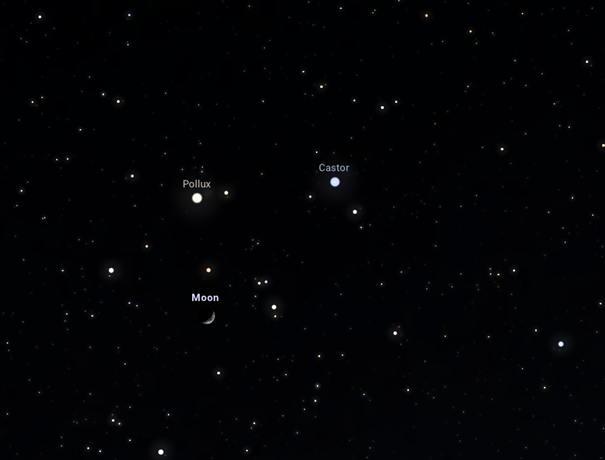 a sötét égen, 21:50-kor együttállást produkál a Hold dagadó sarlója az Ikrek csillagkép két legfényesebb csillagával, a Castorral és a Polluxszal. Az észleléshez nem szükséges semmi más, mint a derült idő, és saját két szép szemünk: mivel az együttállás mindhárom résztvevője fényesen látszik szabad szemmel is, ezúttal nem követelmény a távcső, avagy binokulár használata. Természetesen nem hátrány, ha valaki rendelkezik ilyesmikkel, hiszen az égbolton ekkor a különleges háromszögön túl egyéb érdekességeket is megfigyelhet. Biztatunk tehát mindenkit, aki ébren van este 10 óra körül, hogy nézzen az égre, és keresse meg a Hold pompázatos sarlóját!