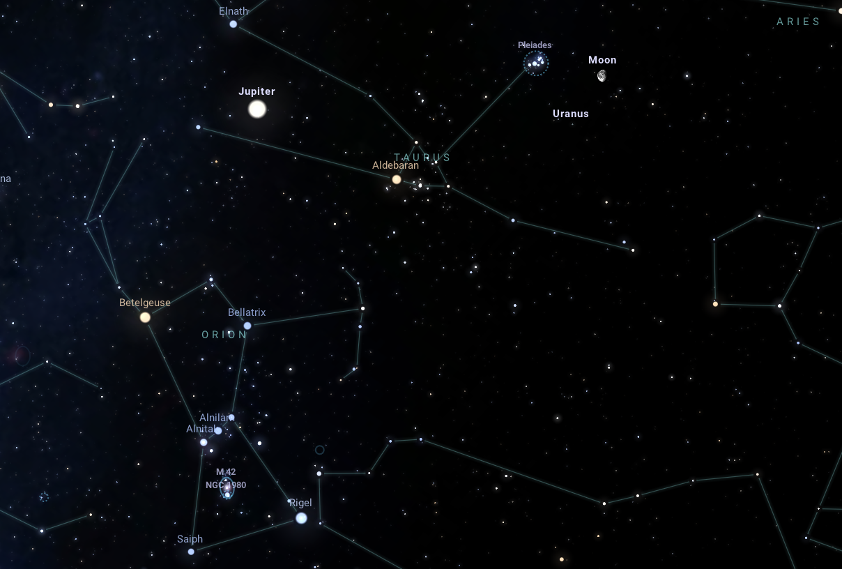 Szintén megfigyelésre méltó az Orion csillagkép, ami ekkor szintén szépen fog látszani a Bika alatt. A majdan szupernóvaként robbanó vörös szuperóriás, a Betelgeuze színével és fényességével feltűnő jelenség, így könnyedén észrevehető. Alatta kap helyet az Orion öve, három egymáshoz közel lévő fényes csillag képében, majd az öv másik oldalán látszik a csillagkép legfényesebb csillaga, a Rigel. Az öv és a Rigel között szabad szemmel is látszik a hozzánk legközelebbi csillagkeletkezési tartományok egyike, az Orion-köd.