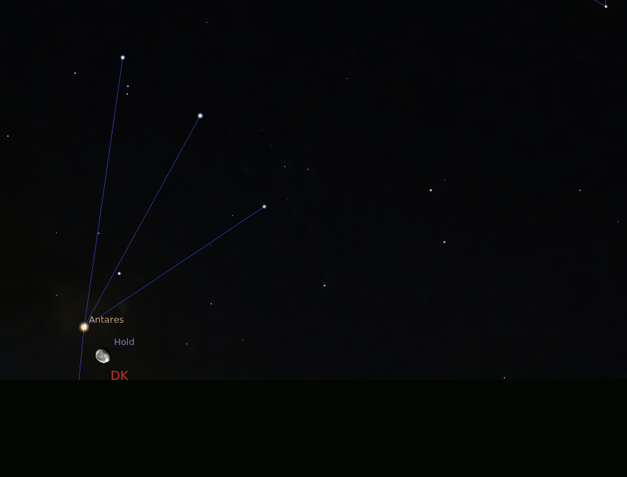 Elsőként még szerdán, 23:50-kor megfigyelhetjük a holdkeltét és együttállását a Skorpió csillagkép legfényesebb csillagával, az Antaresszel. Mivel ekkor a páros még a horizonthoz nagyon közel látszik, az észleléshez érdemes egy olyan helyet keresni, ahonnan a délkeleti égterület jól látszik. Ha nem sikerül elcsípni a páros felkelését és a szoros együttállást, akkor is lehetőség nyílik egy kicsit kevésbé szoros, ámde látványosságát tekintve hasonlóan szép kompozíció megtekintésére: hajnali 1:30-kor ugyanis a Hold és az Antares 10 fokos magasságba ér. Addigra azonban 1,2 fokos távolságba kerül egymástól a két égitest. Mindezek mellett, ha valaki ébren van hajnali 4 óra körül, megfigyelheti a tau Sco jelű csillag fedését is. Minden éjszakázást kedvelő olvasónkat buzdítjuk e felejthetetlen események megfigyelésére!