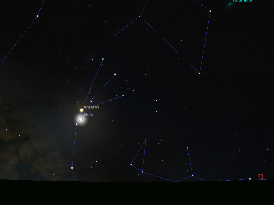Az első attrakció tehát a Hold és az Antares szoros együttállása lesz április 16-án 23:50-kor. Az Antares könnyedén felismerhető arról, hogy a Skorpió csillagkép feltűnő legyezőalakzatának közepén foglal helyet. Ennél azonban könnyebben észrevehetjük a Holdat, amely az említett csillagtól mindössze 49'-re lesz a horizont fölé emelkedés pillanatában.