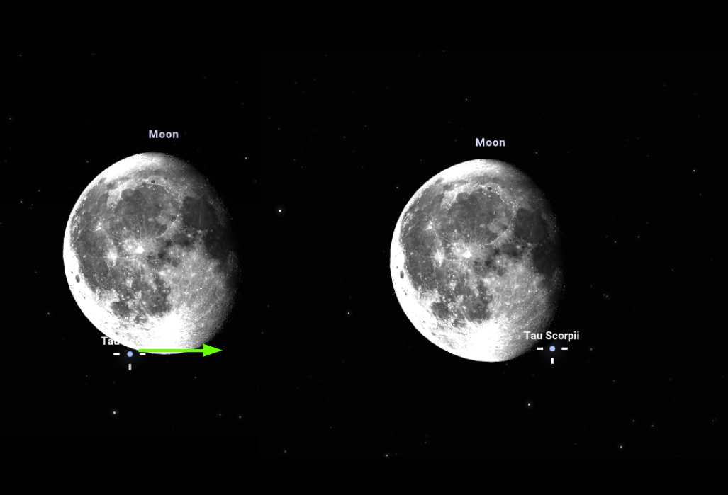 Nem mondható el ugyanez azonban a hajnali attrakcióról, amelynek során a 2,8 magnitúdós látszó fényességű, tau Sco jelölésű, Paikauhale nevű csillag belép a 86%-os fázisú Hold mögé annak világos oldalán. Ezt ugyanis, bár a csillag egy holdfénymentes éjszakán szabad szemmel is könnyedén látszik, most jobban megfigyelhetjük egy binokulár lencséjén keresztül. A belépés 3:56-kor következik be a horizont felett 14 fokkal, míg a kilépés a Hold sötét oldalán bő fél óra múlva 4:34-kor esedékes, 13 fokos magasságban. Mivel egy fényes csillag fedéséről van szó, a kevésbé tapasztalt észlelők számára is élvezetes és távcsővel egyszerűen megfigyelhető csemege lehet. Aki tehát szeret éjszakázni, avagy valami miatt ébren van ezen az éjszakán, mindenképpen vesse tekintetét a csillagos égbolt irányába, azon belül is a délkeleti horizont felé.