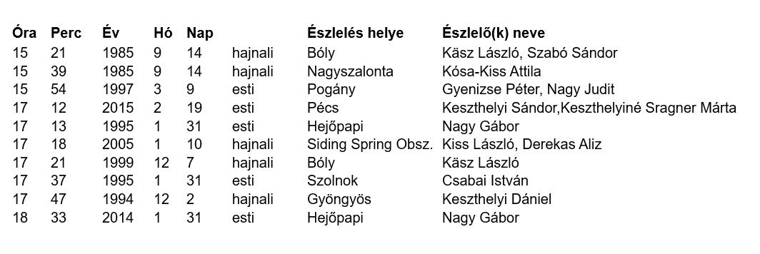A jelenlegi hazai rekordot Käsz László és Szabó Sándor tartja, egy 15 órás és 21 perces holdsarlóval, és ezt a rekordot is közel 40 éve érték el. A mostani újhold egészen pontosan április 27-én 21:31 perckor következik be közép-európai idő szerint. Ez egyben a 2025-ös év legnagyobb látszó átmérőjű újholdja lesz. Az 1%-os holdsarló az esti szürkületben mindössze 22 órás és 54 perces lesz, tehát még egynapos se lesz. Észlelése szép teljesítmény lenne!