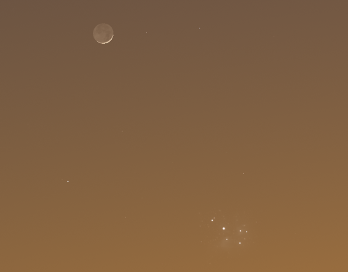 Április 29-én a Hold 6%-os megvilágítás mellett lesz látható az esti égbolton. Érdemes újból a polgári szürkület végén, 20:27-kor (ami az előző naphoz képest két perccel később következik be) kezdeni a keresését szabad szemmel is, de hasznos segítség lehet újból egy kézi látcső. Jelentősen feljebb, 19 fokkal a nyugati látóhatár felett láthatjuk majd a holdsarlót, sokkal könnyebben megtalálható helyzetben, mint az előző napon. 46 óra 56 perccel leszünk újhold után, a 48 órán belülieket meglátni az igazán szép élmény! A Jupiter bolygót megint hívhatjuk segítségül, tőle 15 fokkal jobbra lejjebb találjuk meg az előző napinál vastagabb, de még mindig vékony, fordított C betűt formáló Holdat. Ha várunk ezután este kilenc óráig, a holdsarló alatt néhány fokkal feltűnik a Fiastyúk! A nyílthalmaz azonban mindössze 9 fok magasságban lesz látható a horizont felett, de ekkor már kellően sötét lesz, hogy akár szabad szemmel is megpillanthassuk, de egy kézi látcsőben már biztosan szépen láthatjuk az égi párost. A Hold és a Fiastyúk közös megörökítése igazi csemege lesz az asztrofotósok számára.