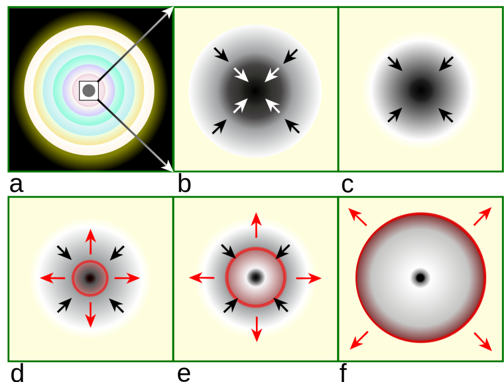 Ennek elképesztő sűrűsége azonban nem csak megálljt parancsol a további gravitációs összehúzódásnak és a rázuhanó gázburoknak, de utóbbi vissza is pattant róla (d).