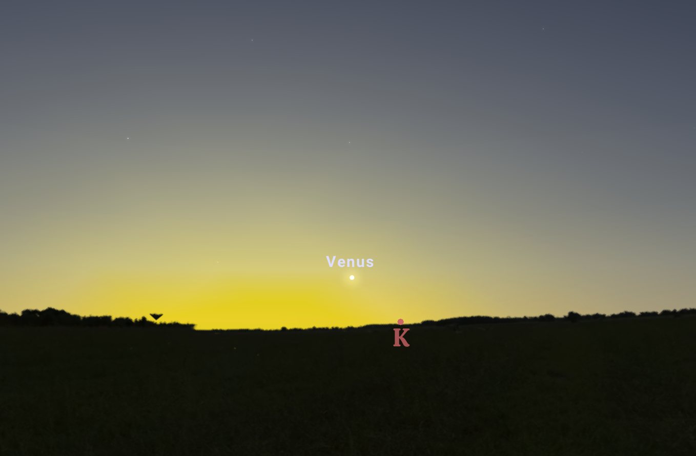 23-án, az alsó együttállása után néhány órával, hajnali 05:09-kor az éles szemű megfigyelők megtalálhatják a bolygót a polgári szürkület kezdetén, két fokkal a horizont felett. A Vénusz ekkor 1%-os fázissal, 59,5 ívmásodperces, hatalmas sarlóval köszönti a korán kelő vadászokat.