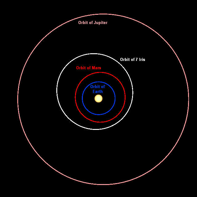 Az Iris a Mars és Jupiter közötti aszteroidaövben kering, és ott az előkelő 4. helyet foglalja el méretben az ismert objektumok között. Átmérője közel 250 km, fél magyarországnyi. Tömege ugyan egy elég nagy szám ahhoz, hogy igencsak fájjon egy rosszul időzített találkozó, de még mindig csak egy tízezrede a Holdénak.