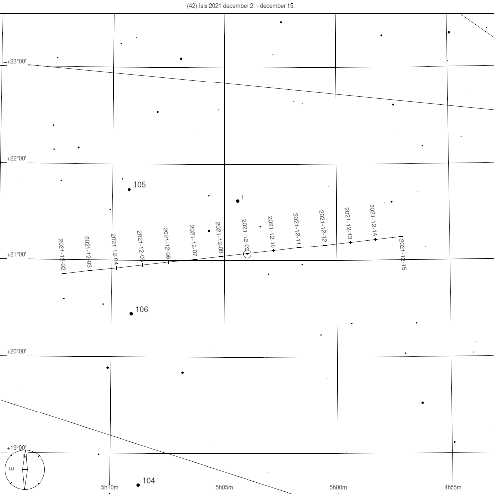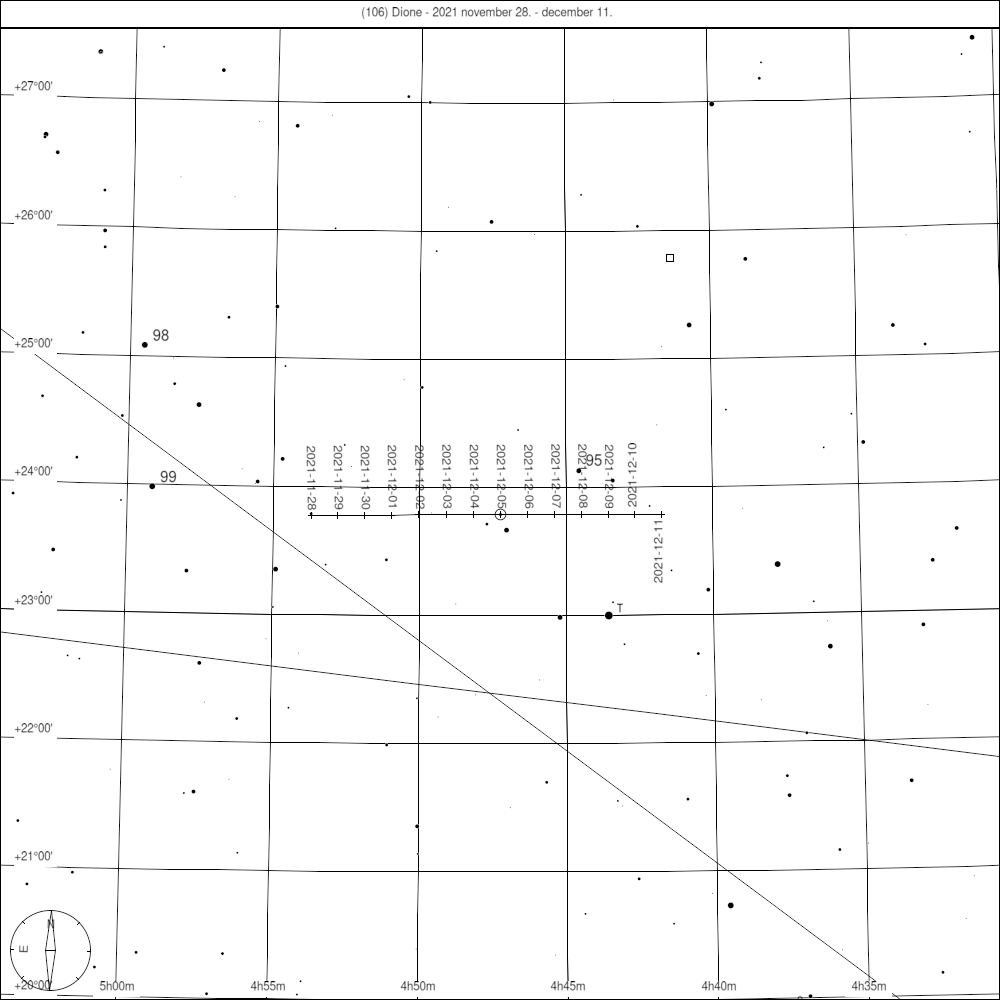 A (106) Dione december elején a Bika csillagképben tartózkodik, oppozíciója december 5-én délelőtt 10:22-re esik, éjfél körül (23:35 CET) jár a legmagasabban déli irányban, de egész este megfigyelhető. A 11,2 magnitúdós kisbolygó halványnak ígérkezik, mindenképp kis de még inkább közepes távcsővel induljunk a keresésére.