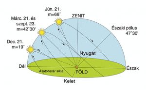 A nap két szélső pont között mozog a látóhatáron. Télen, a téli napforduló időpontjában délkeleten kel és délnyugaton nyugszik, magí nyáron, a nyári napfordulókor északkeleten kel és északnyugaton nyugszik. A tavaszi és őszi napéjegyenlőség napján a Nap fél úton kel a két szélső pont között: éppen keleten kel és pontosan nyugaton nyugszik.