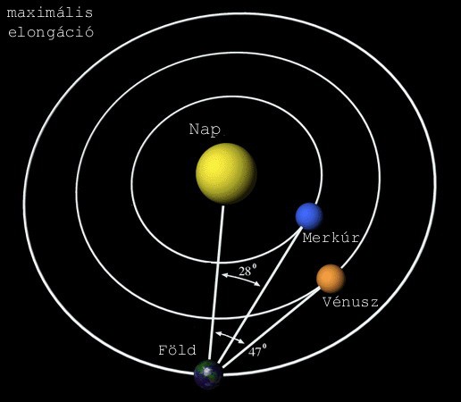 A Földről nézve az égen a Nap és a Merkúr legfeljebb 28 fokra távolodhat el egymástól. Ez a távolság kicsi: ha kinyújtjuk egyik karunkat, s rajta kezünkkel nagyaraszt formálunk, akkor nagyjából az így befogott látószögről van szó.