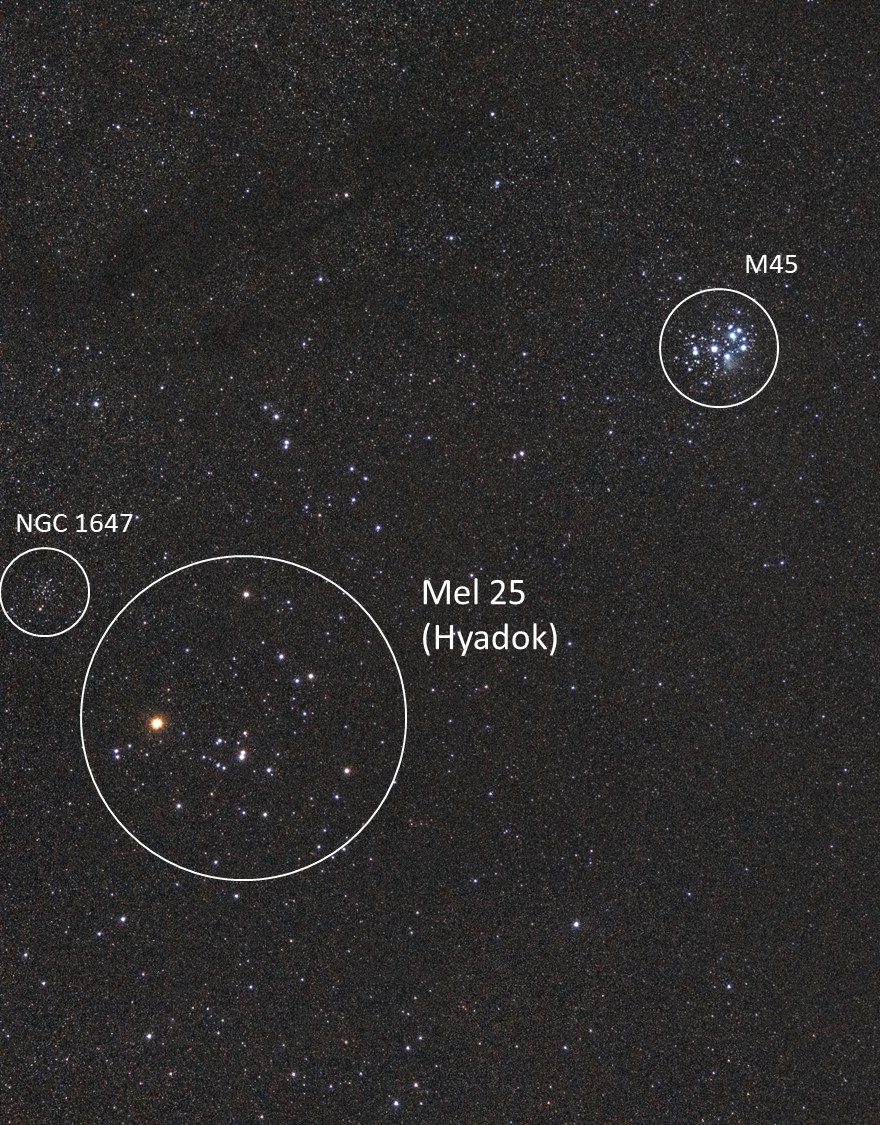 A Hyadok egy szépséges nyílthalmaz a Bika csillagképben 153 fényévnyire tőlünk. Magja 10 fényév átmérőjű, életkorát 625 millió évesre becsülik. A rendszer teljes tömege 400 naptömeg körüli, összesen nagyjából 300 csillaggal (melyek fele kettőscsillag).
