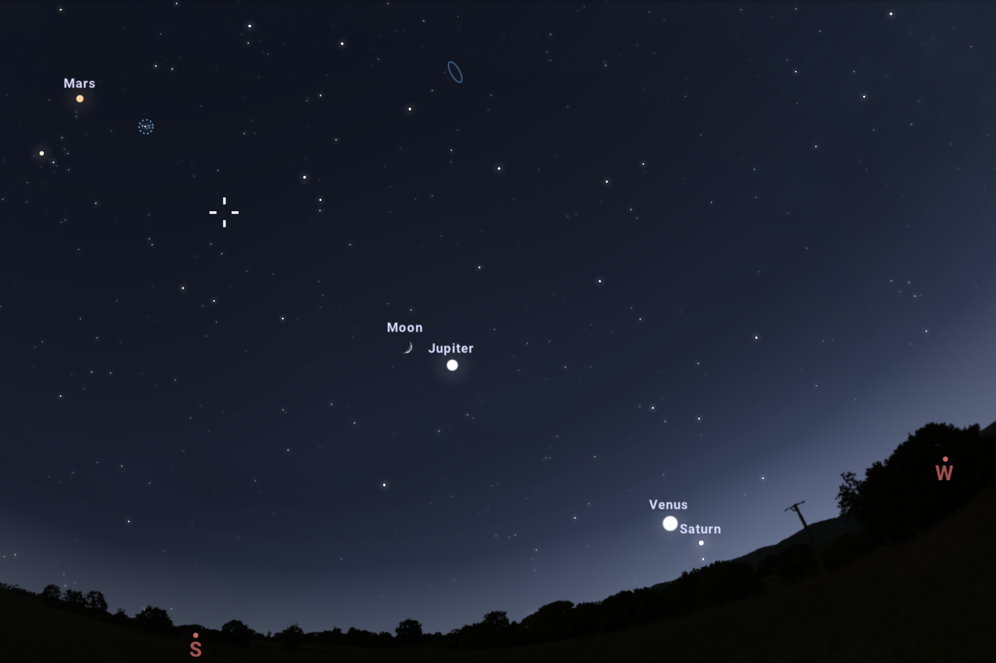 A január 26-i bolygósorakozó. A Naptól kiindulva, sorrendben: Szaturnusz, Vénusz, Neptunusz (nem látszik), Jupiter, Hold, Uránusz (kereszt), Fiastyúk, Mars. 2023.01.26-án, 17:45-kor. Stellarium online szimuláció.